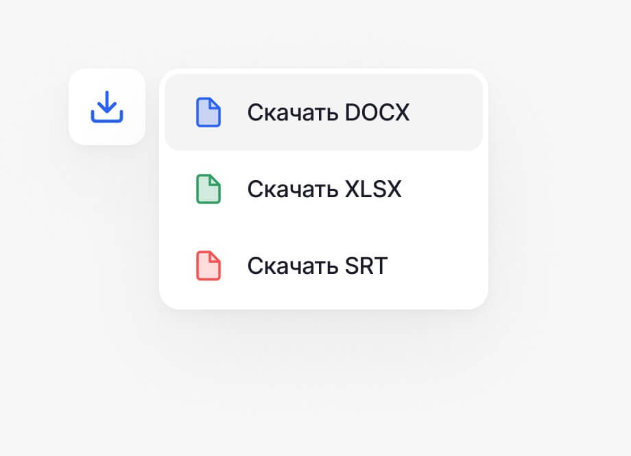 Загружайте MP3, M4A, OGG, WAV, FLAC, WMA, AAC. Экспортируйте в DOCX, SRT и XLSX