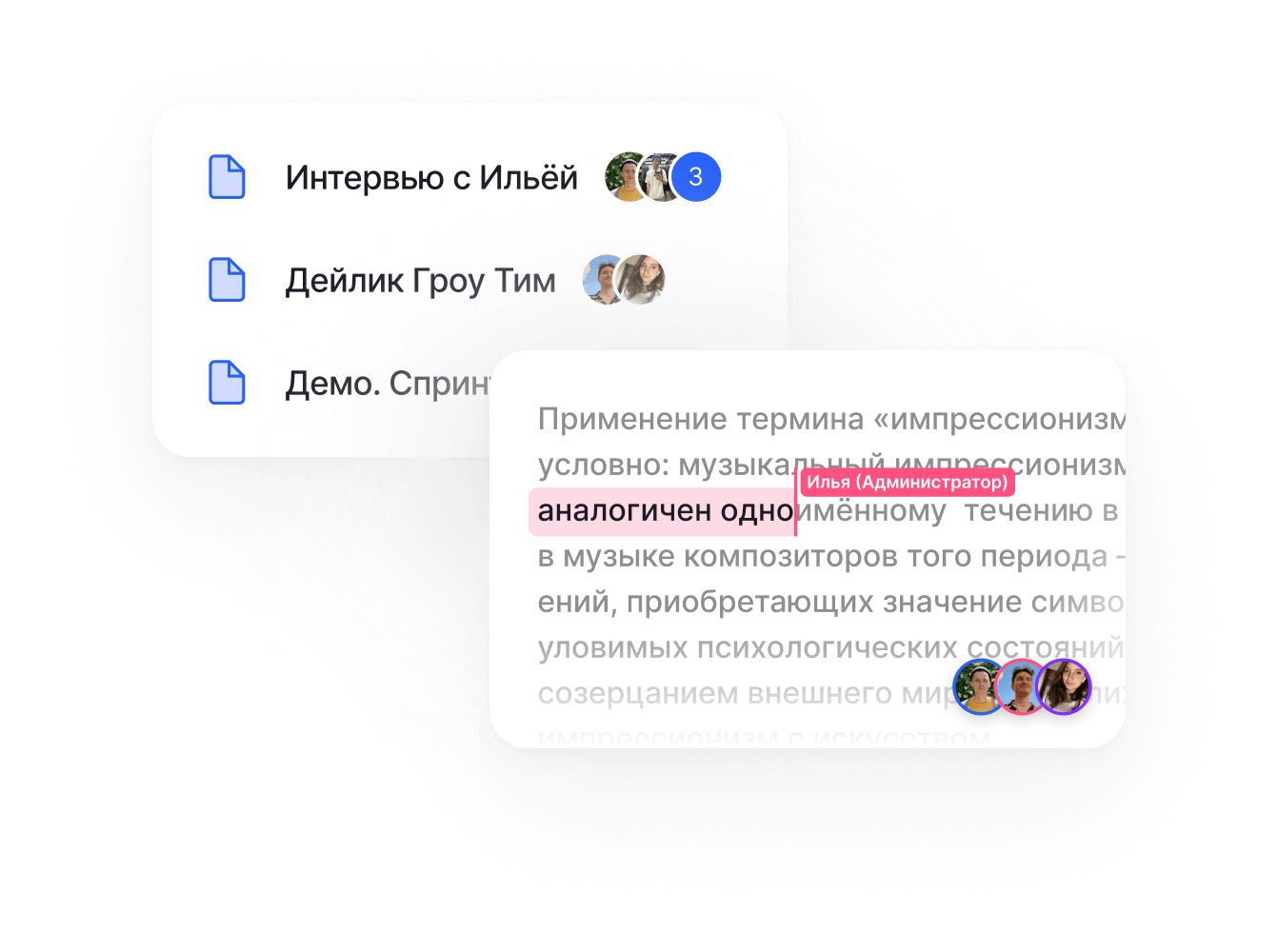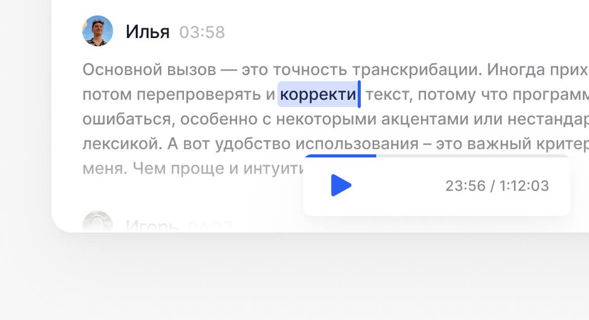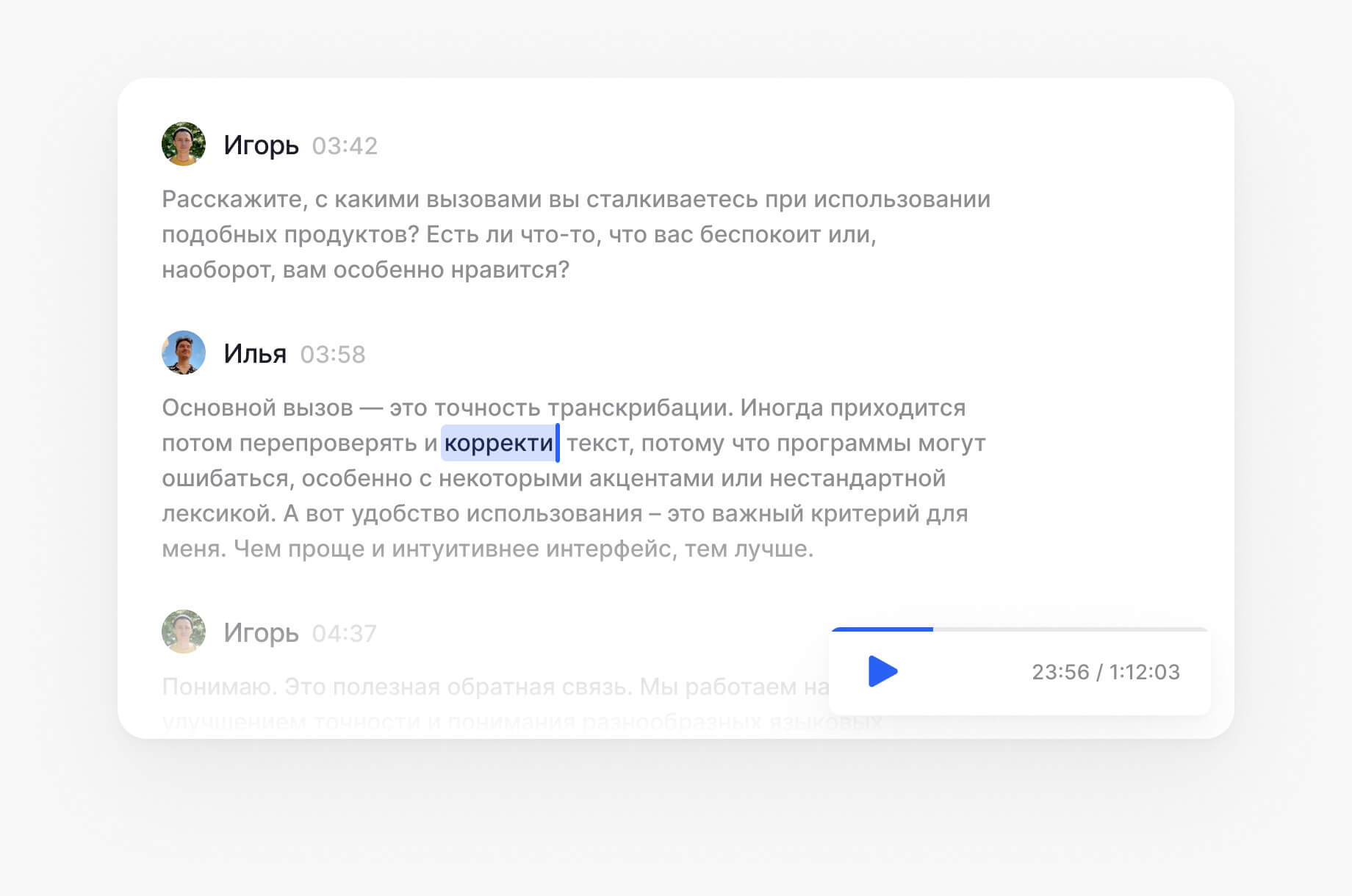 Отредактируйте расшифровку прямо в браузере и легко исправьте ошибки, которые могли возникнуть при распознавании речи. Поправьте реплику каждого спикера отдельно — Teamlogs автоматически распределяет потоки звука, чтобы вы смогли удобно анализировать интервью, дискуссии или вебинары с несколькими участниками